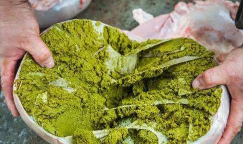 这样美食的做法很复杂,也很奇葩,也是外地人不敢吃的重要原因,做的话首先要把家里的牛饿上一两天,然后再喂一些草料,最后把牛杀掉,把牛胃里面的食材提取出来做成美食,最经典的做法就是把它们做成火锅汤底,然后配上辣椒和牛肉一块吃,虽然做成的火锅汤的颜色是绿色的,看起来有点奇怪,闻起来也有点酸,但是营养价值是很高的。