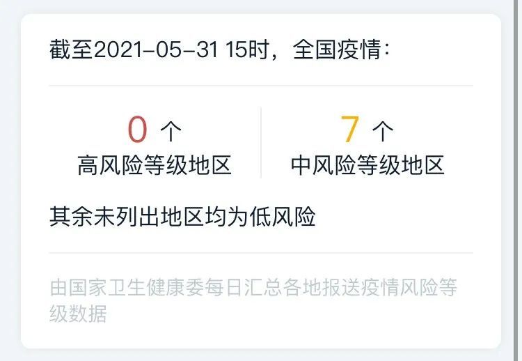 根据中国政务网信息,截至2021年5月31日15时,31省(自治区、直辖市)和新疆生产建设兵团疫情高风险地区0个,中风险地区7个,其他均为低风险。分别为: