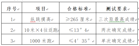 体能测试采取单项淘汰方式进行,凡一项不达标的视为体能测试不合格。体能测试成绩将于测试当日进行公布,并由考生签字确认。体能测试项目及合格标准如下: