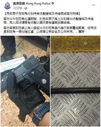 【环球网报道】香港警方今天(30日)晚间在脸书发文表示,警方今天在旺角巡逻期间,于两名男子身上分别搜出仿制枪械及伸缩棍,两人因涉嫌管有仿制火器及管有违禁武器被捕。