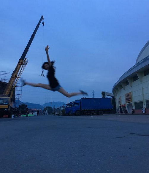 晨光熹微,张天爱身穿黑色短袖上衣和短裤,在大吊车前方跳起在半空中,做了一个大劈叉的动作,还向上伸直左臂向镜头招手,一双大长腿实在太吸睛。