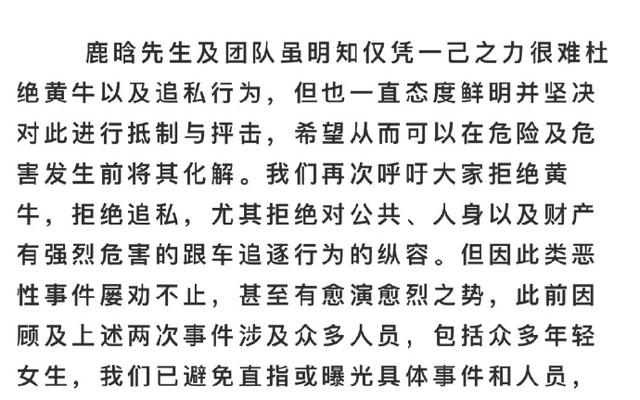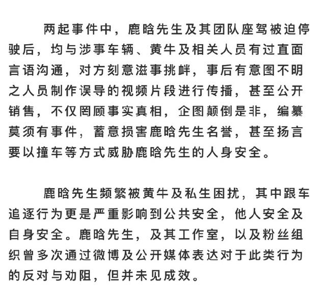 声明中称,两起黄牛跟车事件中,车中载有十余位女生,黄牛车多次逼停鹿晗座驾,置公共交通安全和相关人员安全与不顾,并多次危险驾驶,鹿晗座驾被迫停下。