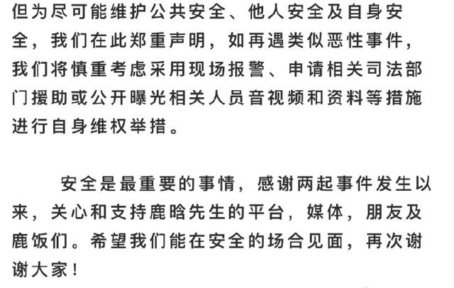 声明中还称,两起事件中鹿晗团队均与黄牛有过沟通,但对方刻意挑衅,将视频进行剪辑售卖,企图颠倒是非,甚至以撞车方式威胁鹿晗生命安全。鹿晗工作室及粉丝多次公开表示对这种行为的反对与劝阻,但未有成效。最后,鹿晗团队再次呼吁大家抵制黄牛的行为,并对关心鹿晗的粉丝媒体表示感谢。