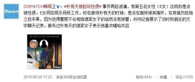据韩媒报道,E女同在娱乐场所工作,称在接待朴有天的时候,差点在厕所被其强奸,在其强烈拒绝之后未果,因为觉得警察不会相信酒家女子的话而没有报警,并向记者展示了当时和朋友的文字聊天记录。服务过朴有天的酒家女子表示他喜欢嘻哈并且不吝啬酒钱和小费,但是有个模式,在乐队进驻音乐开始后,把搭档叫进卫生间,之后的事情就不得而知了。