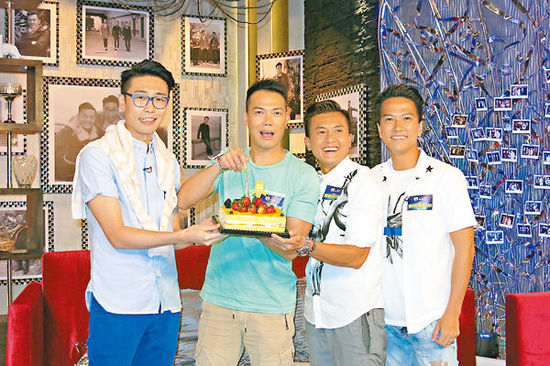 主持人推出蛋糕预祝谢天华(左二)这个月15号四十九岁生日