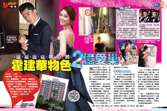 据《周刊王》调查,霍建华最近常进出台北市仁爱路上的某豪宅社区,根据内政部房地产实价登录,该社区每坪(1坪≈3.3米)单价至少新台币185万元,户户都破上亿,据传霍建华打算一口气买2户打通,室内坪数近百坪,市值逾新台币2亿元。不过,霍建华的一位好友认为,霍建华作风较保守,他豪砸新台币2亿元添购新房前,应该会问过林心如的意见,“毕竟林心如是房地产投资高手。”林心如及经纪与霍建华助理,至截稿前均无回应。
