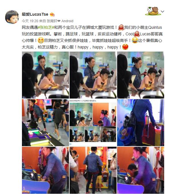 7月20日晚,有粉丝晒出网友偶遇张柏芝带两儿子出来玩游戏的照片,并写道:“网友偶遇张柏芝和两个宝贝儿子在狮城大厦玩游戏!我们的小萌主Quintus玩的投篮游戏啊。攀岩,踢足球,玩篮球,妥妥运动健将,Cool,Lucas哥哥真心帅爆!目测柏芝又会抓很多娃娃,毕竟抓娃娃超级高手!这个暑假真心太充实,柏芝这精力,真心服!happy,happy,happy!”