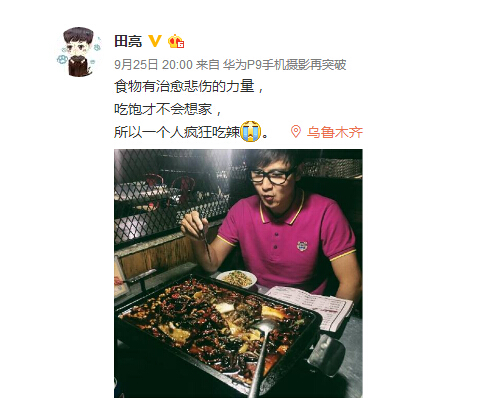 昨晚,田亮在微博晒出自己一人吃辣的照片,并配文表示:“食物有治愈悲伤的力量,吃饱才不会想家,所以才深夜一人疯狂吃辣。”