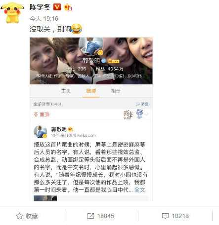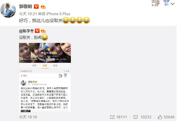 此前,郭敬明深夜更博发毒誓强烈否认“移情别恋”汪铎,陈学冬也否认与郭敬明的绯闻,表示只是朋友,不要编故事给他加戏。郭敬明随后也转发微博发文:“好巧,我这也没取关”,同样配了哭笑不得的表情。