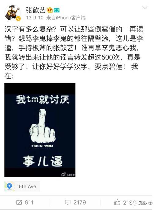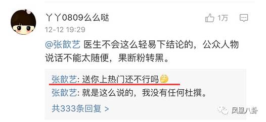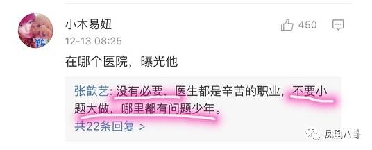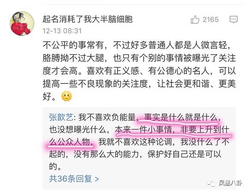 至于张歆艺在评论中说的别把我当公众人物,小妹(凤凰八卦微信号:entifengvip)也不能苟同,从事演员这份职业,微博粉丝过千万,在享受公众人物的便利时(小妹(凤凰八卦微信号:entifengvip)就做不到拿别人的名字挂号),是不是也应该承担起公众人物的社会责任呢?