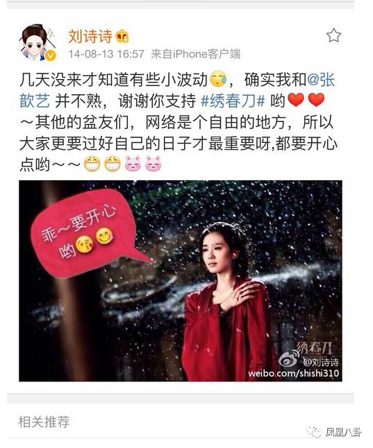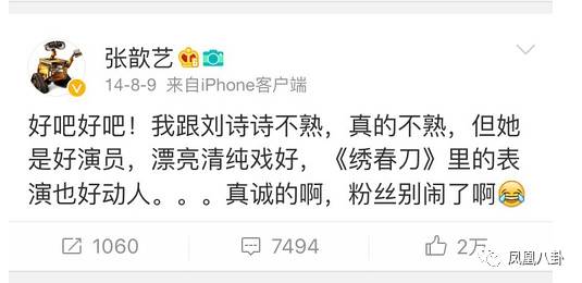 眼看事情越闹越大,刘诗诗自己发微博表态“谢谢张歆艺的夸奖”,这件事才最终翻篇。