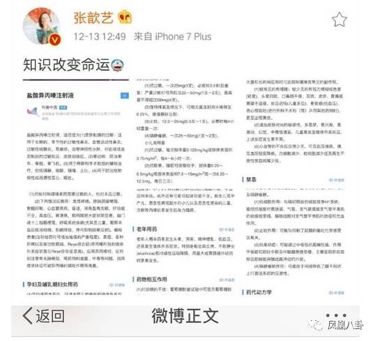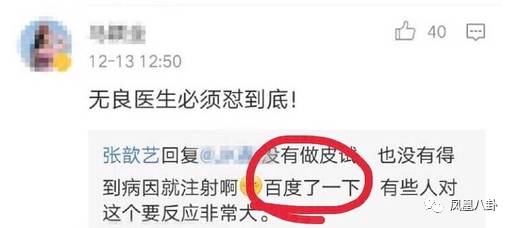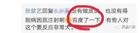 张歆艺不满被“强迫”打针也有她的看法,她贴出了百度百科对该药物的解释,称“知识改变命运”,认为医院在不给自己做“皮试”的情况下就打针是不负责任的。