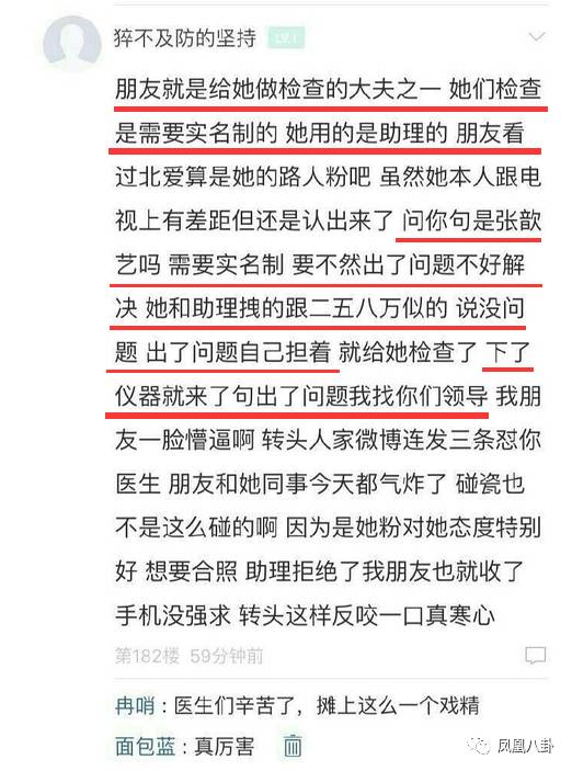 不少网友也补充说明了当时的情况,力证医生当时给张歆艺做了全套检查,张歆艺在结束检查后还威胁医生“出了问题找你们领导”。