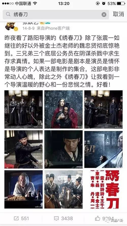 2014年,张歆艺发一条微博夸赞电影《绣春刀》的导演和男演员。