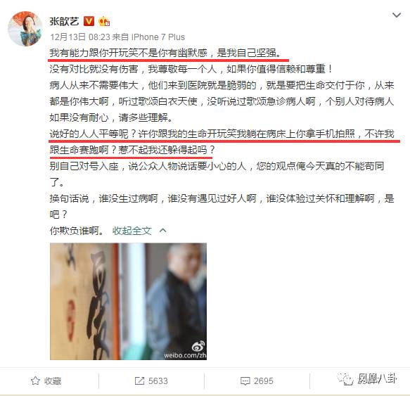 张歆艺不堪被网友吐槽,发了第二条微博称“自己没有针对所有医生,只是针对个别没医德的医生”,“自己生病躺在床上还被医生偷拍”,表明态度称“公众人物也有吐槽的资格,这锅她不背”
