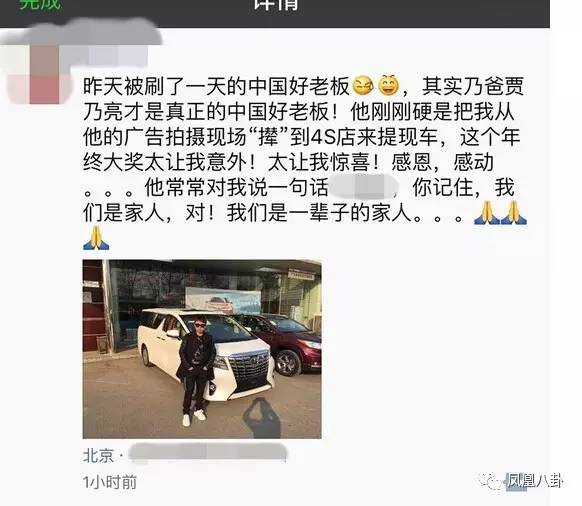 去年春节,贾乃亮经纪人就在自己的朋友圈内晒出了年终奖:一辆价值七八十万元的汽车。