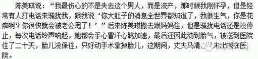 更毁三观的是,“小三”还打电话骚扰陈美琪。据说,陈美琪就是在接了电话后,精神恍惚摔倒造成流产的。甚至出院后,“小三”还打电话嘲讽她是“只不会下蛋的鸡”。