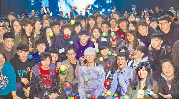信(前排右四)昨准备了9万6000颗彩球与现场歌迷同欢。