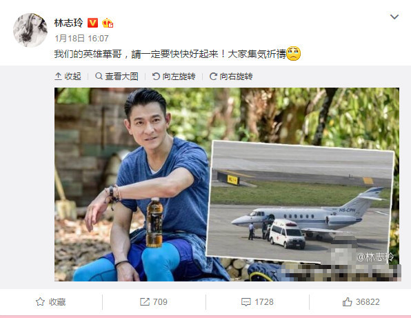 也曾因意外坠马受伤的林志玲发博为刘德华祈祷:“我们的英雄华哥,请一定要快快好起来!大家集体祈祷。”刘德华的伤情牵动粉丝们的心众多网友纷纷为其祈祷,希望他平安无事,还有粉丝贴心叮嘱志玲,“也请你照顾好自己。”