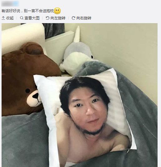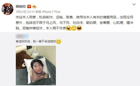 近日,有网友晒出印有高晓松自拍的抱枕,附文称“有话好好说,别一言不合送抱枕”。面对网友的调侃,高晓松也幽默发文,称“未经本人同意,私自制作、运输、贩售、使用与本人有关的情趣用品,出现任何意外,包括但不限于马上风、马下风、吐白沫、翻白眼、老寒腰、心肌梗、精冲脑、屁暖床等症状,本人概不负责”。
