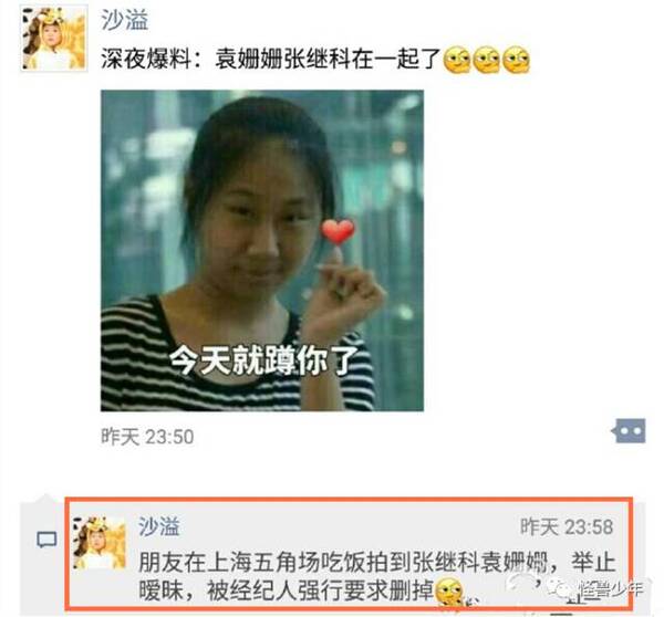 今年12月,有网友曝光袁姗姗张继科在上海五角场吃饭,拍到照片时,却被经纪人强行要求删掉。
