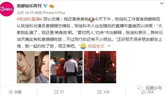 谁知张继科发声明直接否认恋情:我还是单身狗!张继科表示,跨年日当天确实有和袁姗姗吃饭,不过同行的还有不少朋友。“正好那天很多朋友都在上海,就一起约吃了饭,很正常吧。”