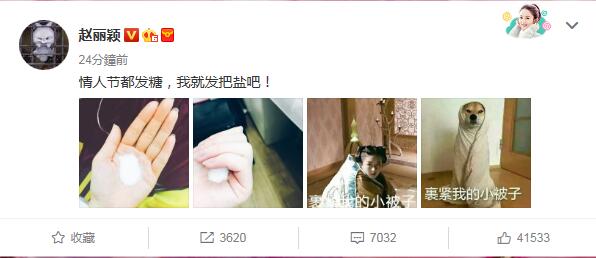 2月14日情人节,众多明星忙着发糖。赵丽颖另辟蹊径,在微博写道:“情人节都发糖,我就发把盐吧!”