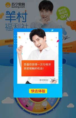 在H5中,用户每天只有一次机会选择情景,聆听偶像的暖语,想得到其他情景下的鼓励怎么办?据悉,苏宁易购和杨洋为粉丝开辟“羊村福利社”,羊毛们可以每天到H5里的福利社打卡抽奖,获得“洋光充电”的机会。同时,福利社里还有手机壳、红包等礼品,给羊毛们更多幸福。