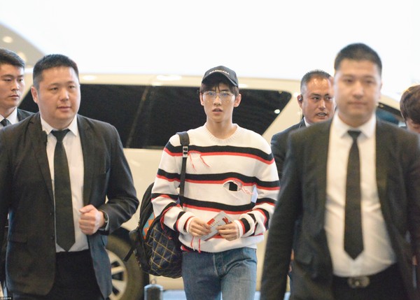 据台湾媒体东森新闻云报道,男星杨洋因《微微一笑很倾城》人气暴涨,紧接着7月要上映新片《三生三世十里桃花》,到11日凌晨还在为电影配音。他白天抵达北京首都机场,穿破洞毛衣现身,立刻吸引大批粉丝抢拍,此时有6名西装保镖维护秩序,还被捕捉保镖好奇偷瞄男神衣服的画面。