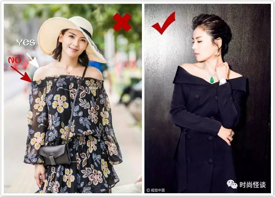 手臂粗的话,一字肩应该卡在肩膀上,而不是手臂上。稍带V字型能更好地拉长脖子。
