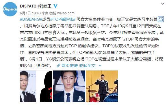 据“DISPATCH韩娱王”微博,BIGBANG成员TOP(崔胜铉)吸食大麻事件参与者,被证实是女练习生韩某。