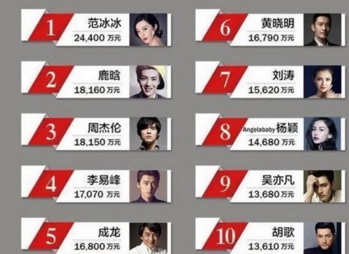 在榜单中,范冰冰2.44亿稳坐第一,鹿晗1.816亿,周杰伦1.815亿随后紧跟,鹿晗李易峰吴亦凡杨洋井柏然流量鲜肉志愿上榜。