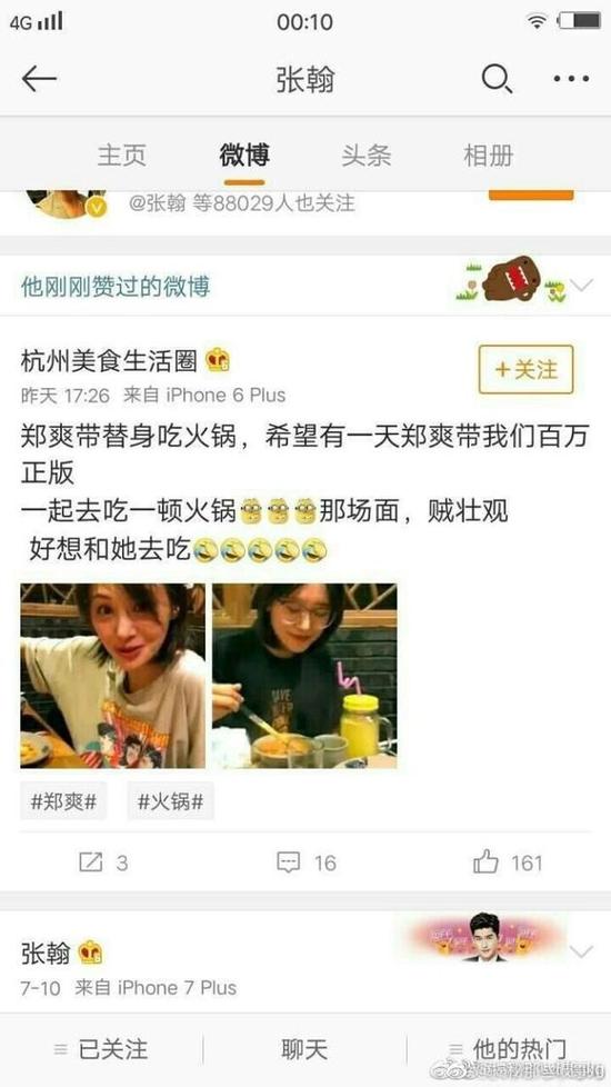 在网友晒出的截图中,该微博晒出了郑爽与替身妍妍二人一起吃火锅的画面,还附文“希望有一天郑爽带我们百万正版一起去吃一顿火锅,那场面,贼壮观,好想和她去吃。”而张翰则为这条微博点了赞。