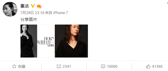 董洁在7月29日晚上11点10分更新了两张写真照片,微博内容只有四个字,分享图片,没有过多的赘言。董洁上一条微博发布时间是2012年6月5日,按时间来算的话,董洁已经有5年时间没有更新微博了,这一次她选择了重新回归。