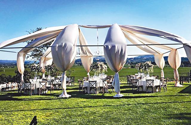 北京时间昨日凌晨,乐基儿和拍拖两年、从事有机食品生意的Ian于加州结婚,婚礼于当地一个酒庄内举行。现场布置分三个部份,新人行礼的地方,分左右摆满一排排木座椅,最前方搭了一个用绿叶围着的框架,让一对新人站在中间被白色鲜花包围,接受亲友的祝福。另外,还有一个长方形棚架,晚宴则在一个大型米色帐篷下进行,现场放了九张圆形餐桌。