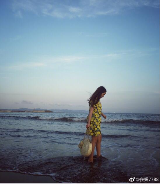 偶尔穿着颜色亮一点的,就是黄色大花,看着多多提着菜篮子在海边玩水,网友还以为是多多妈。