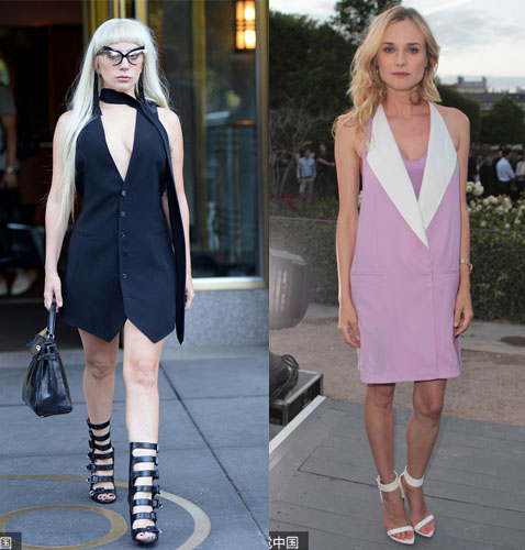 Lady Gaga、Diane Kruger如果实在想尝试不妨选择这种马甲的款式,用露肤来缓解没有腰身的尴尬,但是这里你看到了,Lady Gaga的高筒凉鞋是有多么截短比例。