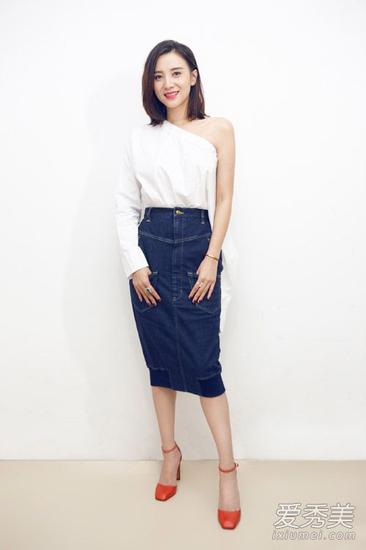 宋佳穿白色单肩上衣配牛仔包臀裙,又知性又性感,红色高跟鞋明艳复古,简单轻松就穿出时髦范。