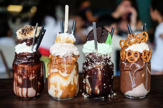 Freak Shake顾名思义,就是一种milkshake与各种你意想不到的topping的疯狂组合,被称为是夏日甜品最冰爽的爆款美食,吃完扶墙走还让你想再 来!milkshake可以与布朗尼蛋糕和奶油水果又或者是棉花糖奶油水果等组合搭配,这么多好吃的放一起,五颜六色的,太好看!