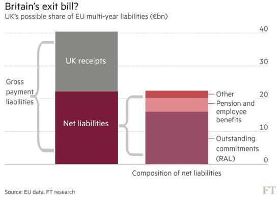 欧盟认为,英国需要为过去的支出承诺付出代价。英国《金融时报》的一项分析称,“英国面临最高达200亿欧元的欧盟“离婚账单”,这意味欧盟的共同预算正成为达成英国退欧协议的最大政治障碍之一。