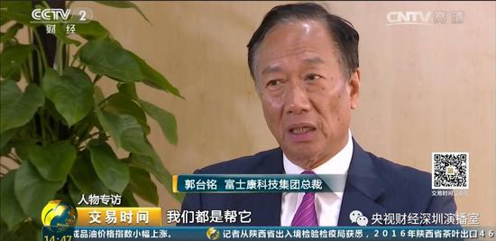 郭台铭:你要说富士康是哪里的公司,我会说是国际性的公司,我们在全世界都有,只是说我们主要的制造基地在大陆。很多关键的零组件,我们会初级在大陆做,然后再把它组装搬过去,其实这是一个产业链的过程。