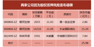 文章来源:微信公众号券商中国 原标题:又见跌破平仓线!停牌股票增多,盯防质押比例高且跌幅大的那些股 股市连续下跌,让股权质押警报再度拉响。仅在今晚,就有银河生物和科林环保两家公司宣布,由于股价跌破警戒线,公司将从明天开始停牌,其中银河生物已...