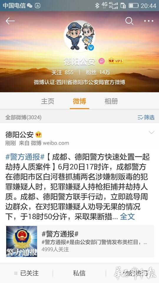 华西都市报讯(客户端记者唐金龙摄影报道) 6月20日17时许,成都警方在德阳市区白河巷抓捕两名涉嫌制贩毒的犯罪嫌疑人时,犯罪嫌疑人持枪拒捕并劫持5名人质(两大人三小孩)。成都、德阳警方联手行动,立即疏导周边群众,在对犯罪嫌疑人劝导无果的情况下,于18时50分许,采取果断措施,安全解救出人质,抓获犯罪嫌疑人杜某(女,34岁,什邡人)、曹某(女,25岁,什邡人),缴获自制手枪1支及子弹。