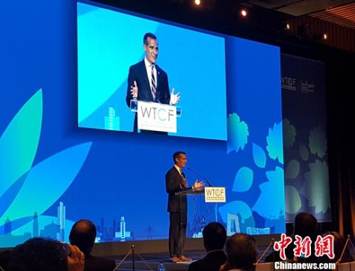 洛杉矶市市长贾塞提在开幕式上致辞。中新社记者 张朔 摄