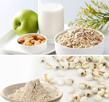 薏米:薏米是一种美容食品,常食可以保持人体皮肤光泽细腻,消除粉刺、斑雀、老年斑、妊娠斑、蝴蝶斑,对脱屑、痤疮、皲裂、皮肤粗糙等都有良好疗效。薏米本身所具有的润泽肌肤美白补湿行气活血调经止痛等功效十分卓著应用于皮肤上又具有自然美白效果能提高肌肤新陈代谢与保湿的功能可以有效阴止肌肤干燥又可使身体轻捷,还可减少患癌的几率。每天用一小匙煲粥喝美白的功效很神奇,是从里到外的美白哎!还能瘦脸瘦身哦