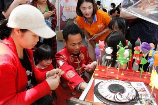 非物质文化遗产糖人画、黏土捏人、手工铁艺、民族布艺扎染、壮锦织绣等现场创作展示的手工艺品,全方位展示传统与现代艺术文化融合发展新常态,为市民和游客带来别样的视听感受。
