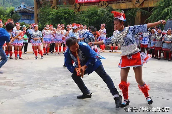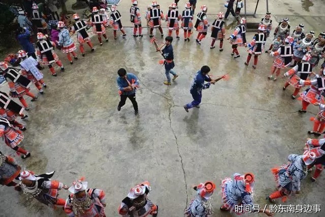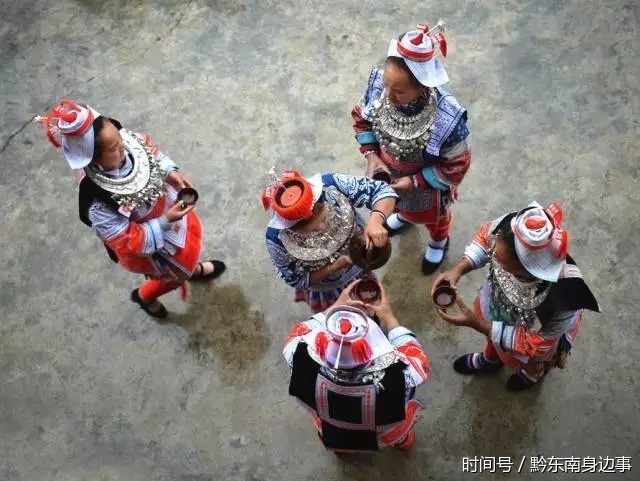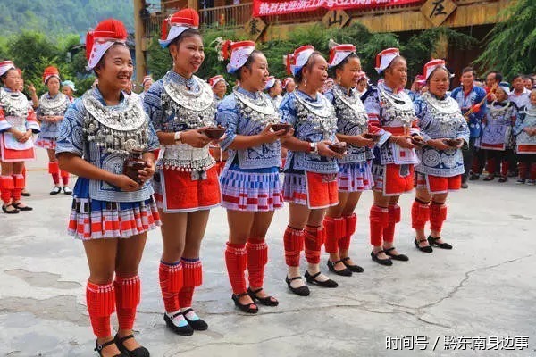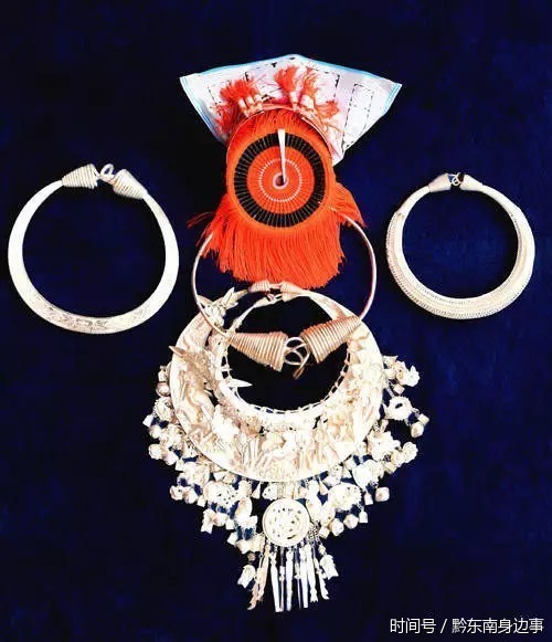 亻革家女装,从头到脚都是武装。银簪是箭,银圈是弓,头顶是头盔,肩披是铠甲,绑腿腰带上图案绘的是先祖率九千九百九十个雄兵征战的历史。